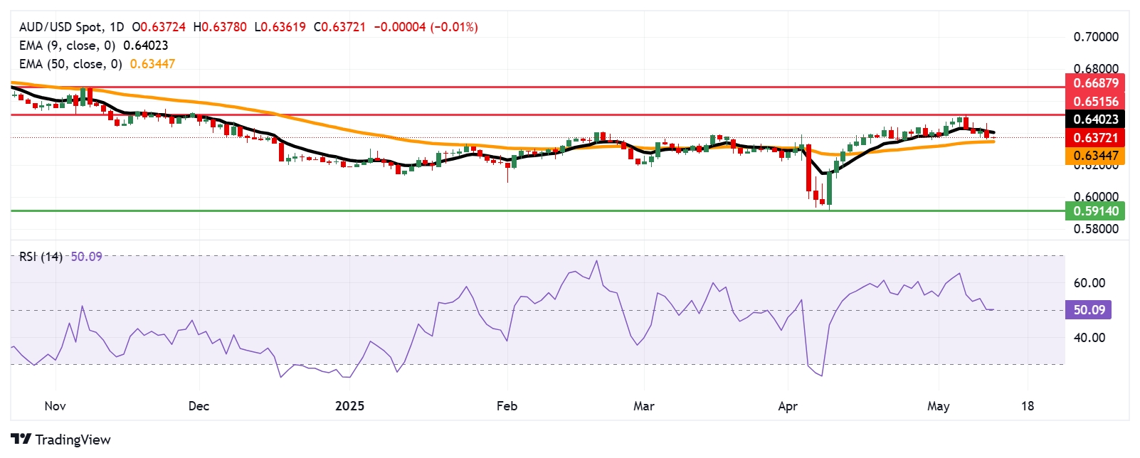 周二,澳元兑美元汇率上升至接近0.6400。技术分析表明看跌趋势,该货币对交易价格低于九日指数移动平均线(EMA)。此外,14日相对强弱指数(RSI)已降至50下方,强化了看跌情绪。