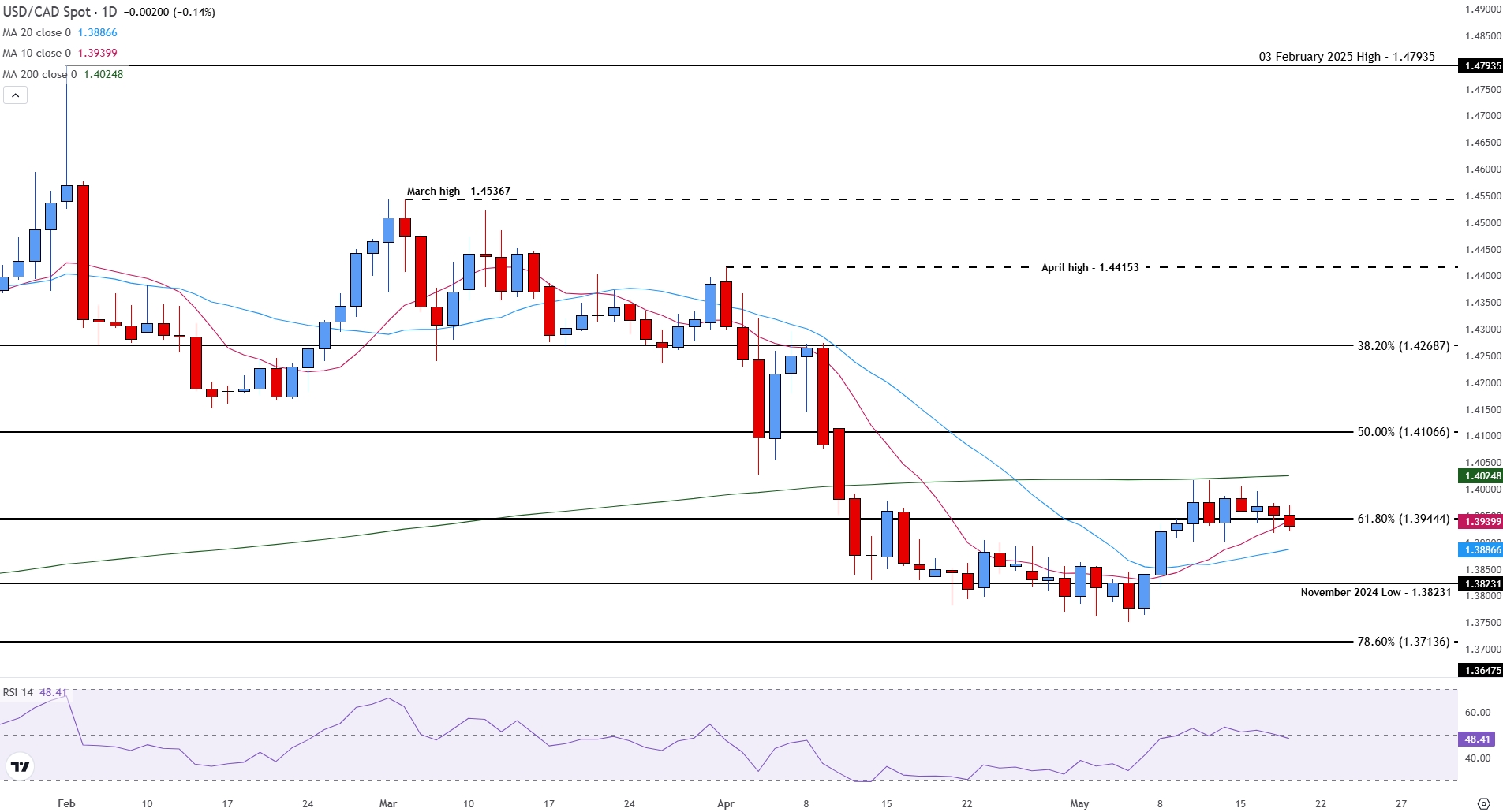 对于上涨走势,如果 decisively 突破并收盘高于 1.39444,则表明有上涨潜力,目标是 200 日移动平均线和上述走势的中点 1.41066。