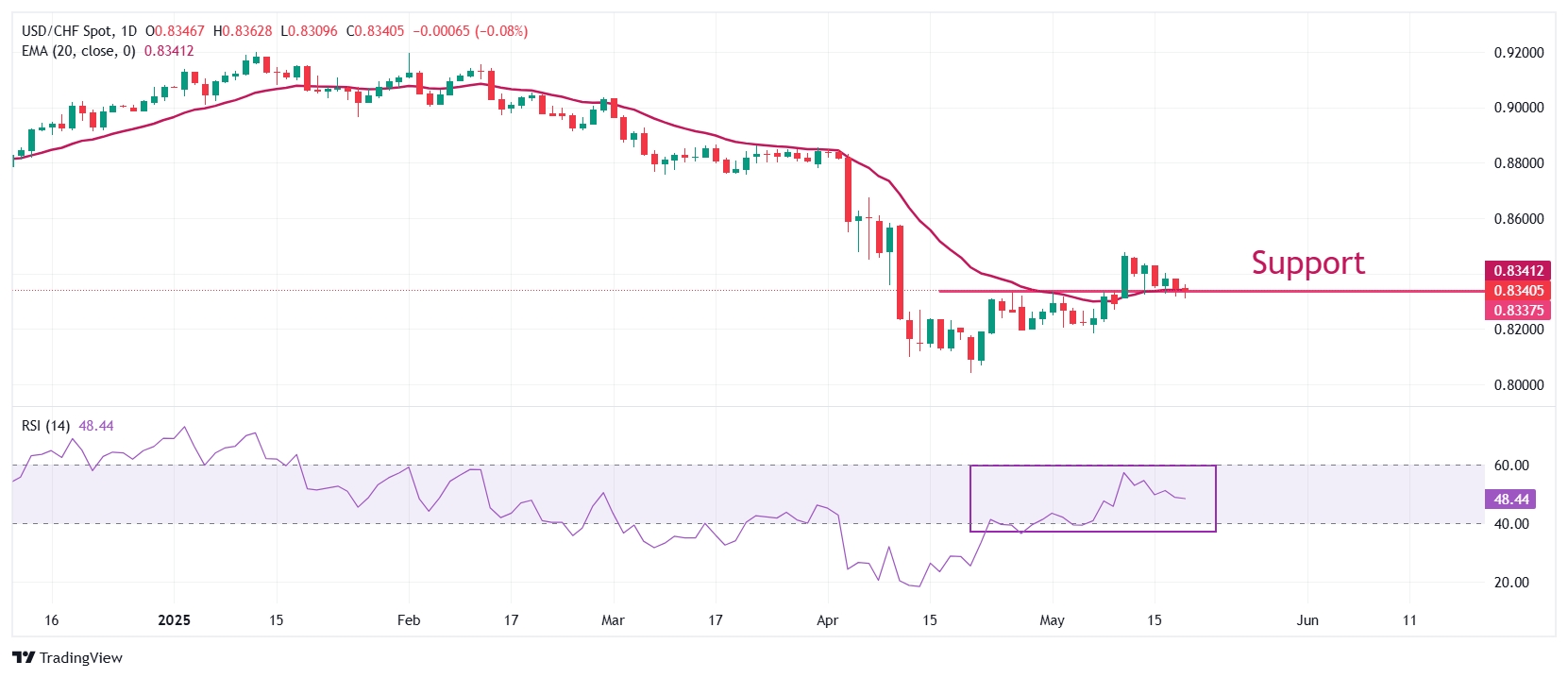 USD/CHF 指标显示美元/瑞郎在4月25日的低点0.8335附近形成了一个垫子,这个位置曾经是该货币对的重要阻力位。资产在20日指数移动平均线(EMA)附近波动,目前该EMA约为0.8340,表明市场呈现横盘整理趋势。
