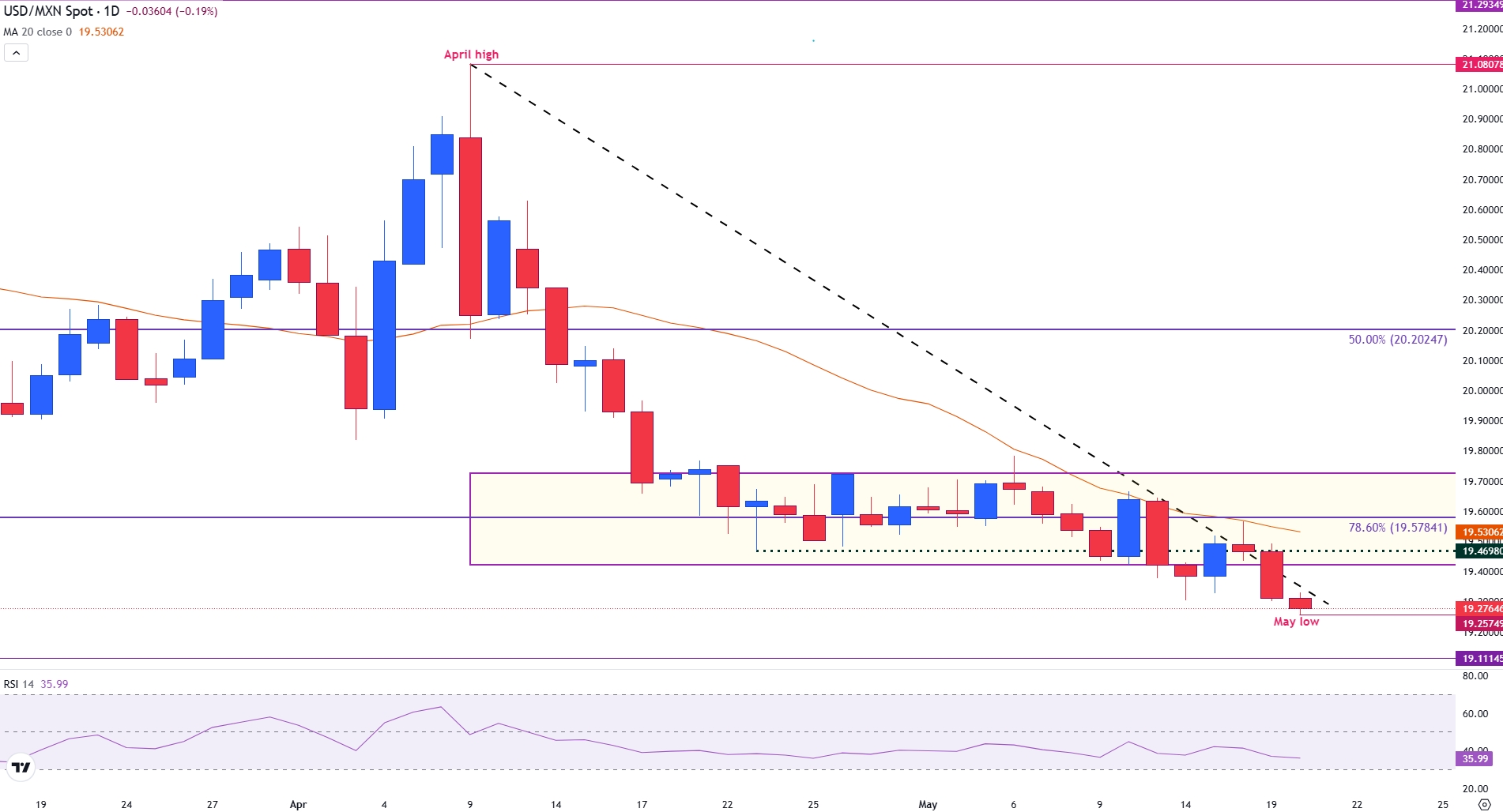 随着市场反应,美元/墨西哥比索已下跌0.20%,在撰写本文时,低于19.30的关键水平。