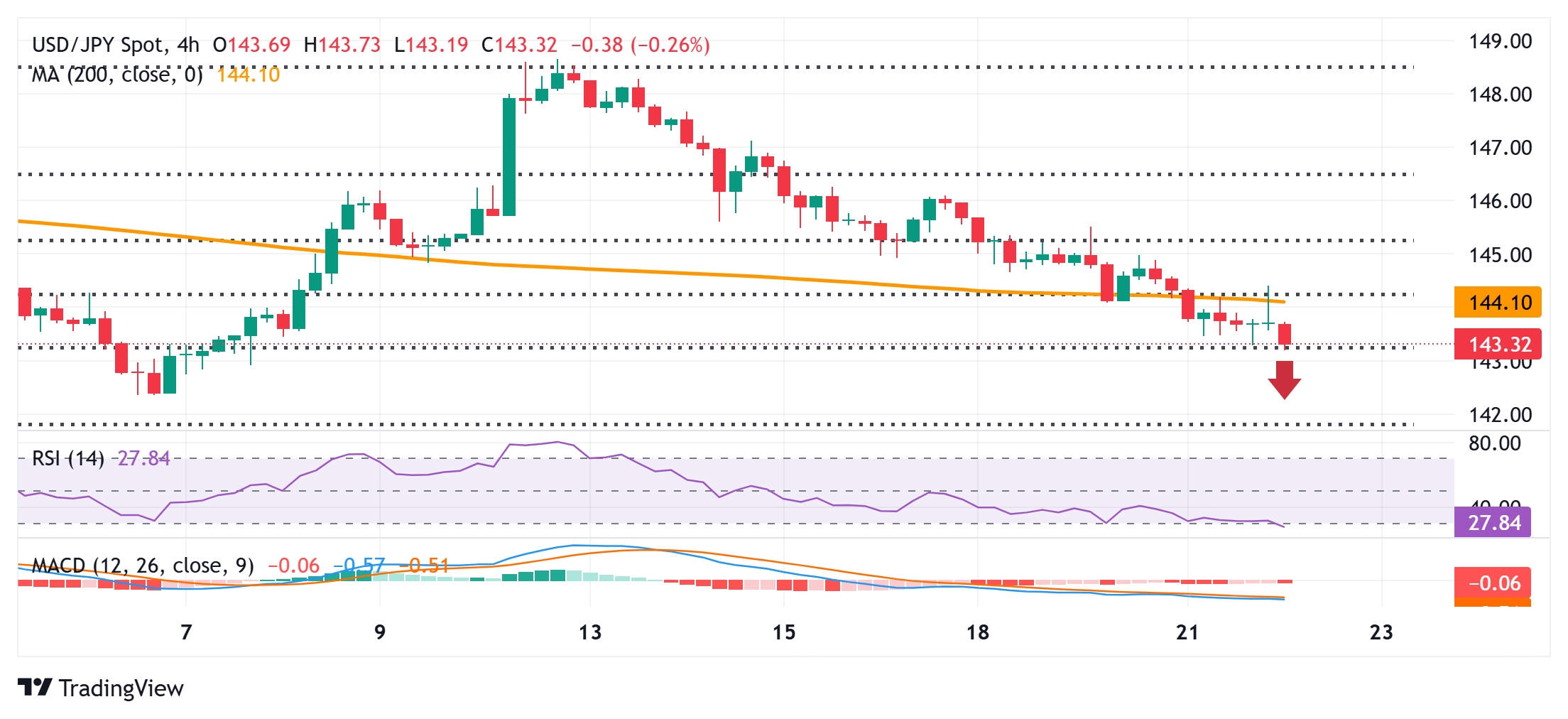 与此同时,日线图上的振荡器刚刚开始呈现负面趋势,表明美元/日元货币对的最短期阻力仍然在下方。然而,4小时图上的相对强弱指数(RSI)已经接近进入超卖区域,因此在进行下一次下跌定位之前,等待一些短期整理是明智的。也就是说,如果接受低于143.20区域,即61.8%斐波那契回撤水平,可能会引发一些技术性抛售,将现货价格拉低至143.00整数位,然后到达142.40-142.35区域的下一个相关支撑位,并最终到达142.00标记。