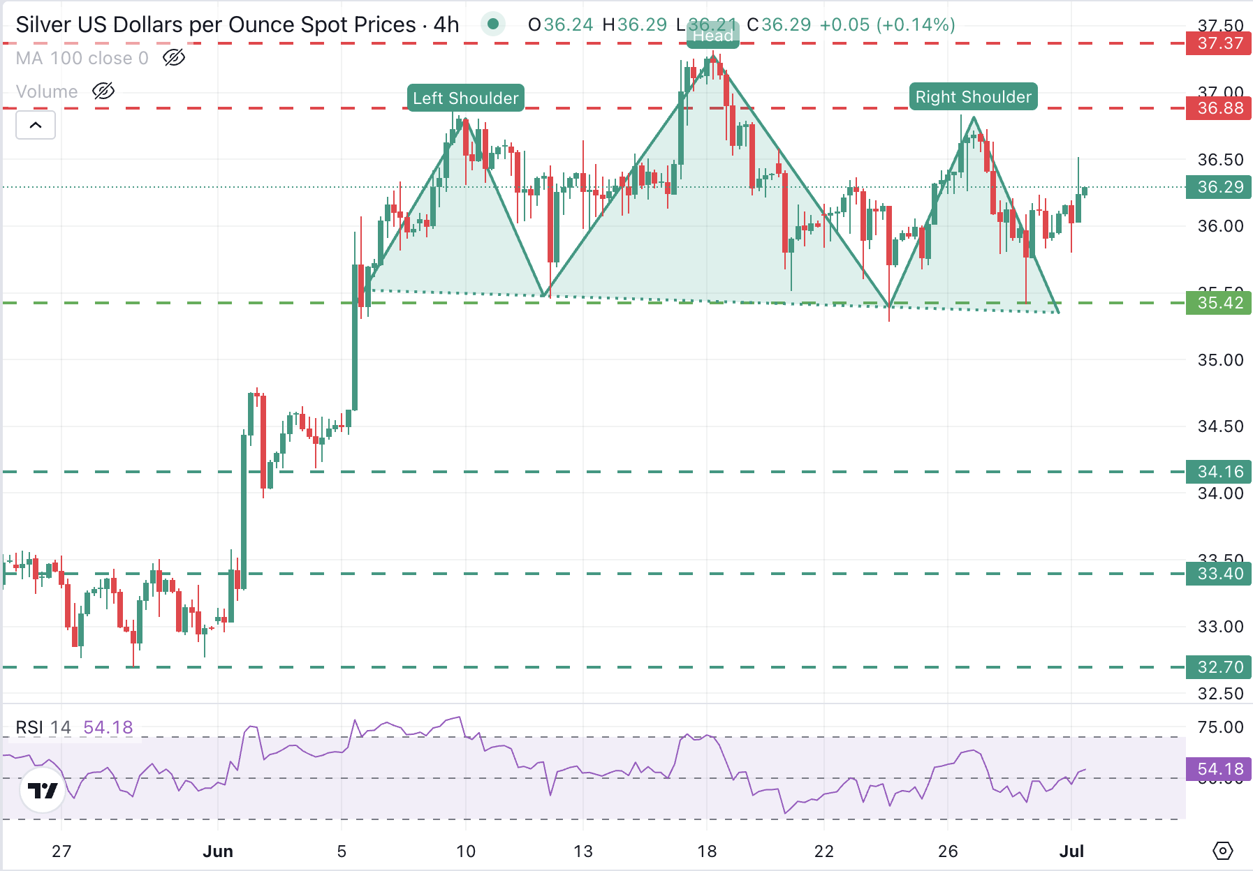 银价 (XAG/USD) 从周一的低点每盎司3540美元反弹至日内高点每盎司36.50美元,目前仍在延续这一走势,贵金属受到对避险资产需求增加的支持,同时市场情绪日益谨慎。。特朗普关于贸易谈判缺乏进展的言论以及财长贝莱特在谈判进行中威胁将在7月9日引入关税的言论,重新引发了对全球贸易前景的担忧,并抑制了投资者的风险偏好。