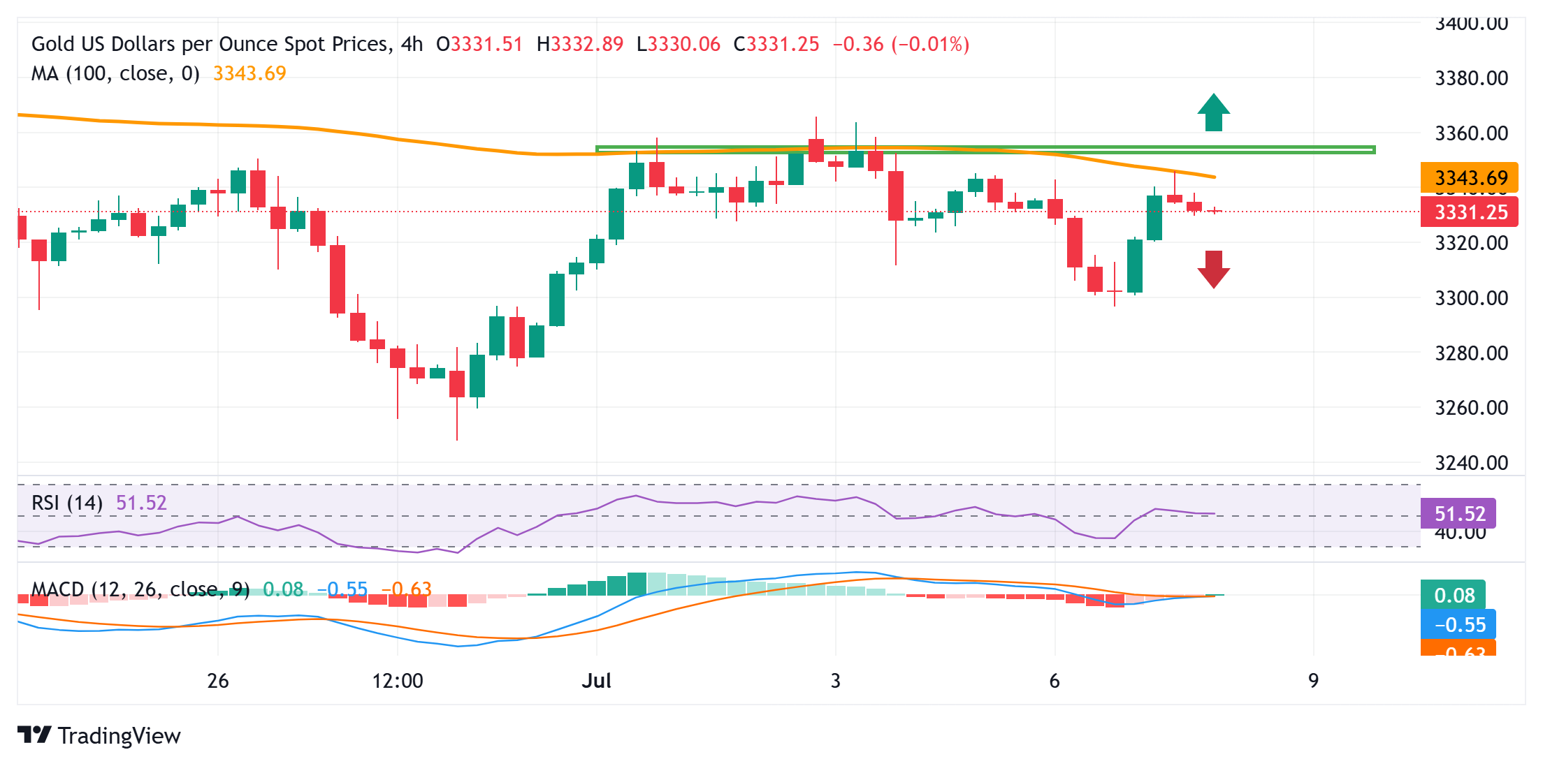 黄金价格在H4图表上低于100-SMA似乎容易受到攻击;空方需要等待在3300美元以下获得支撑。