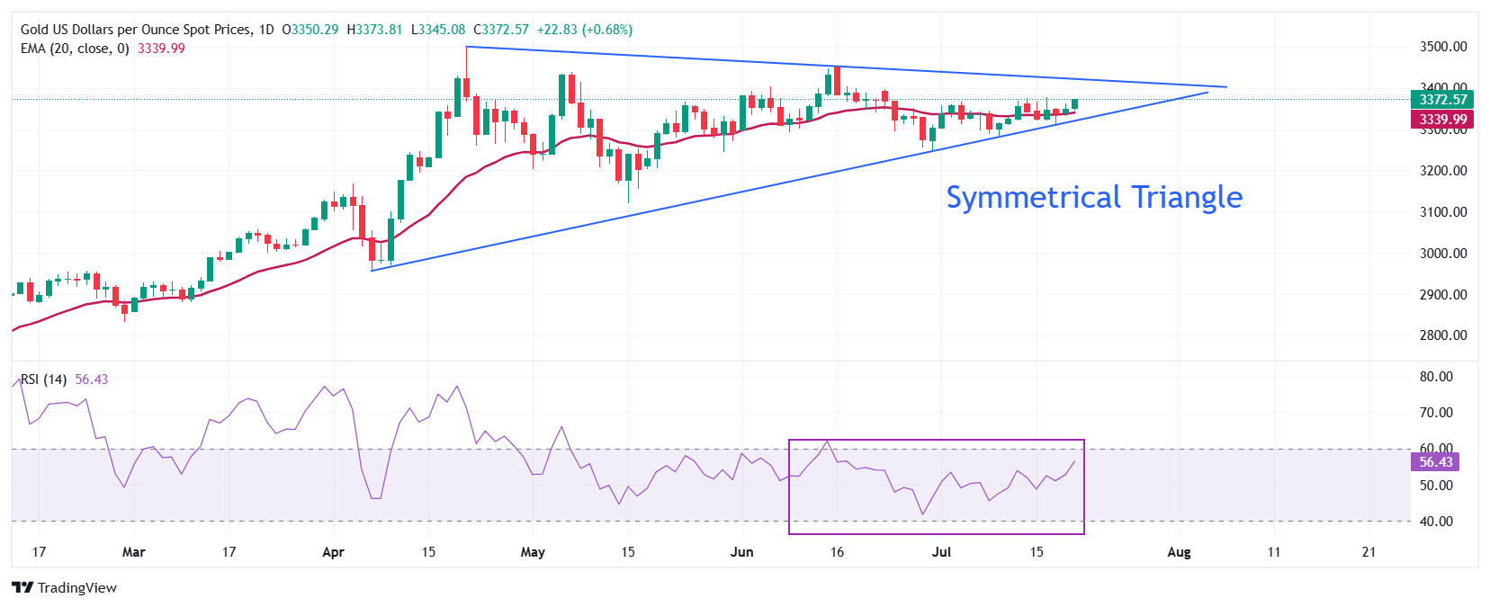 黄金价格在日线图上形成对称三角形,这表明波动性正在收缩。上述图表模式的上升趋势线从5月15日的$3,120.83低点开始,而其下降边线则从4月22日的大约$3,500高点开始。