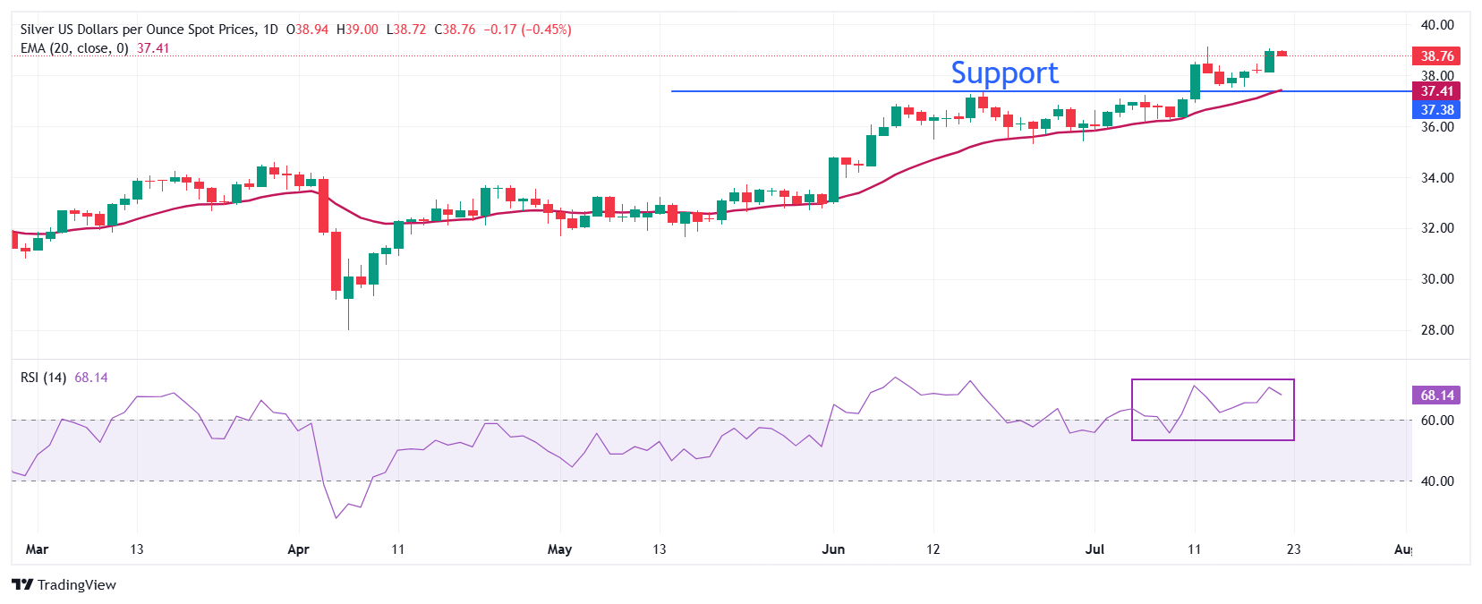 银价在39.00美元附近维持在十年来的高点附近。接近37.40美元的呈上升趋势的20日指数移动平均线(EMA)表明短期趋势看涨。