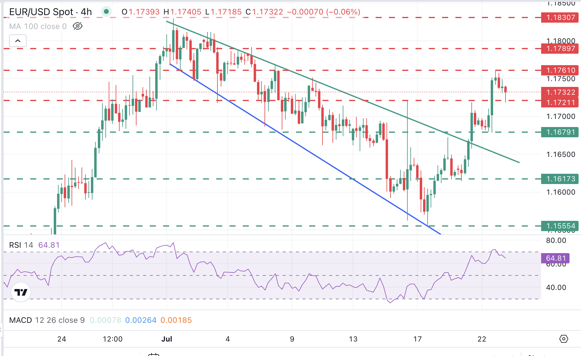 周三早些时候,美国总统唐纳德·特朗普宣布了一项与日本的“重大贸易协议”。从几周前宣布的25%的关税中,对来自亚洲国家的进口商品的关税已降至15%,而根据特朗普的说法,日本将向美国投资5500亿美元。美元在这一消息传出后从低点反弹。