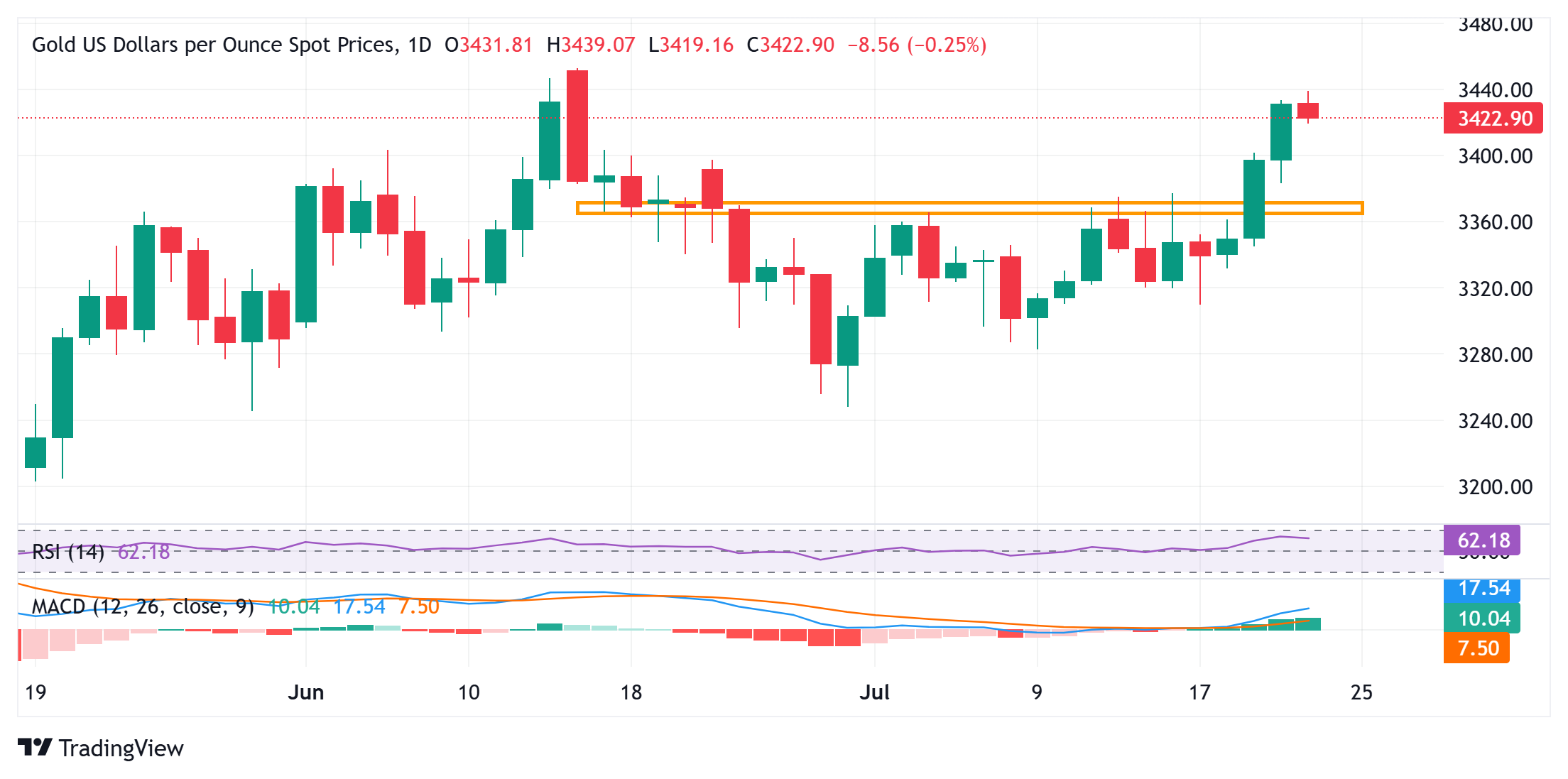 另一方面,亚洲时段高点目前在3438-3439美元区域,似乎在7月 swing 高点3451-3452美元区域之前构成短期障碍。持续突破后者应该为向4月份触及的心理位置3500美元区域的测试铺平道路。