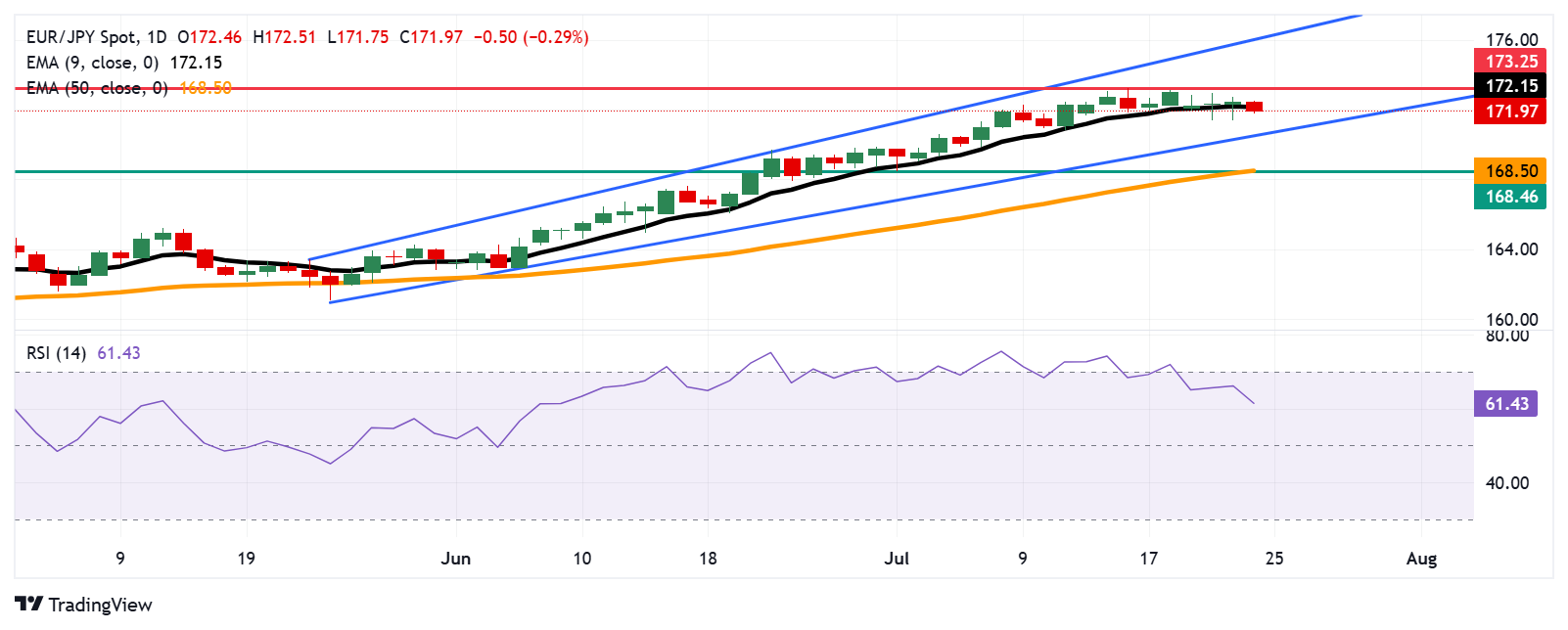 欧元/日元打破了其五连胜,亚洲时段周四交易于171.90附近。随着技术分析显示日线图表中该货币交叉在上升通道内向上移动,看涨情绪正在加强。