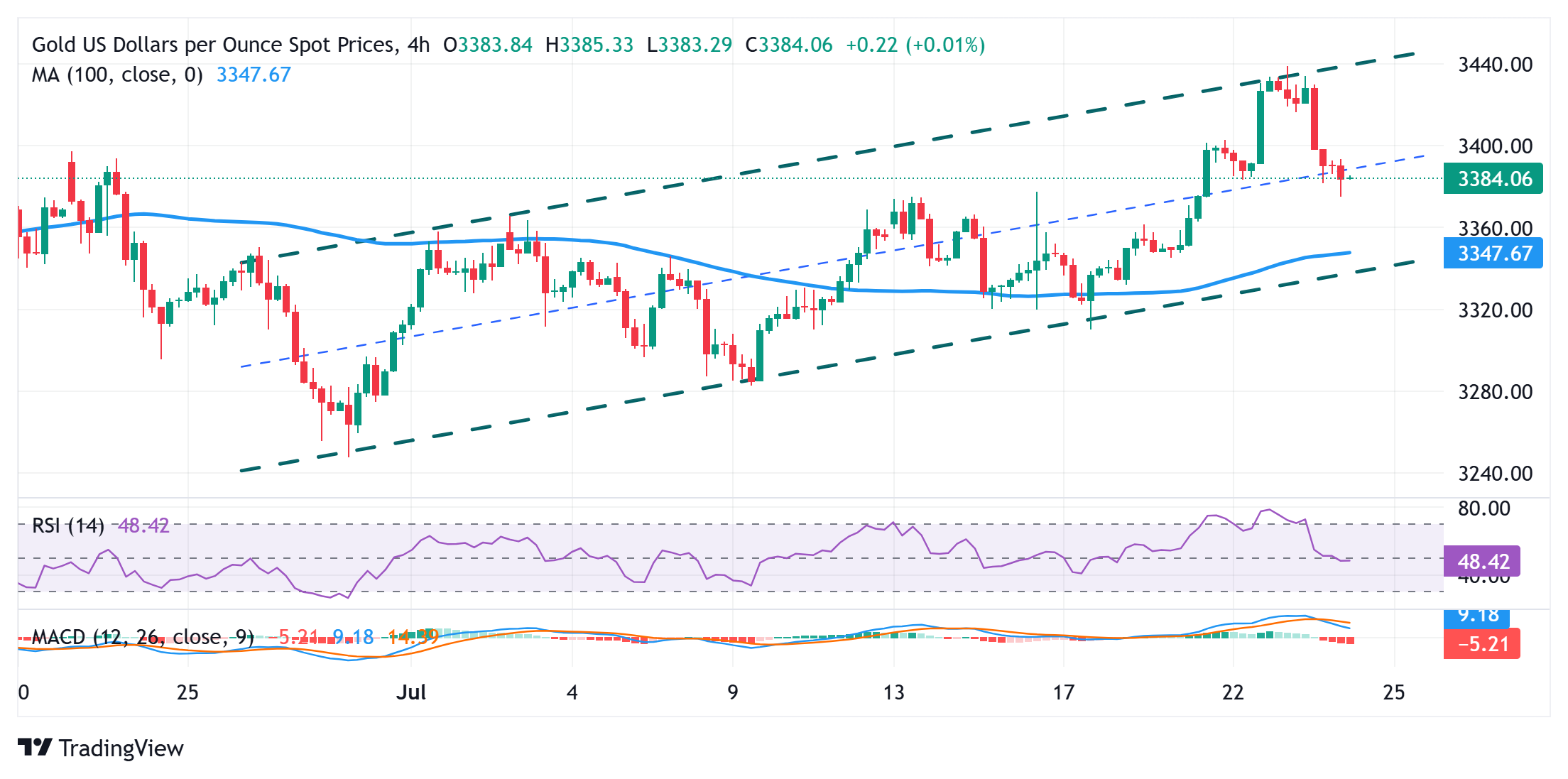 黄金价格徘徊在3370美元的关键阻力位转支撑位;逢低买入应有助于限制进一步的损失。