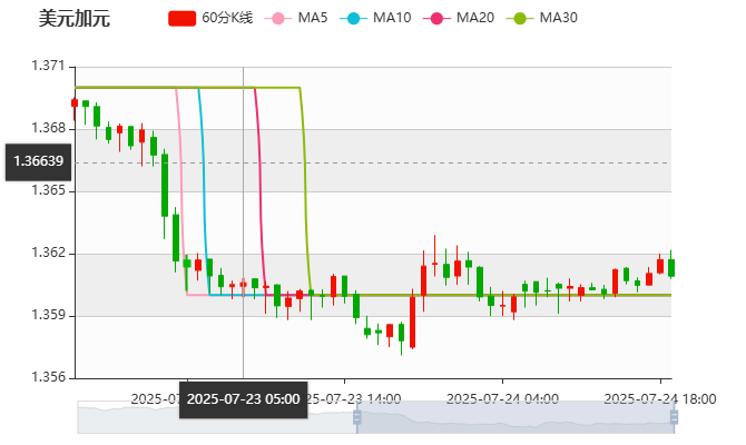 周四(7月24日)亚盘早盘,美元兑加元最新价报1.3599,涨幅0.03%,开盘价为1.3599。尽管国际油价持续在1个半月低位附近震荡,制约了加元的上涨动能,但最新公布的加拿大国内经济数据展现出令人鼓舞的韧性。