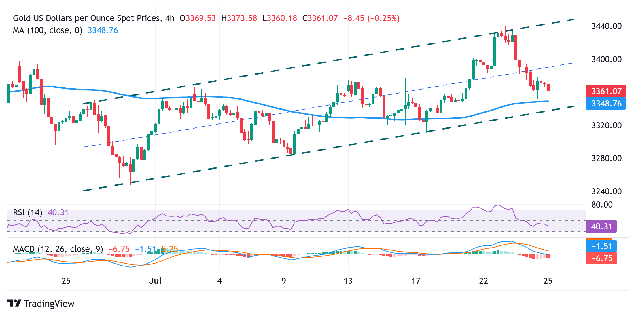 黄金价格可能会在H4图表上100-SMA附近吸引一些逢低买入者,大约在3300美元左右。