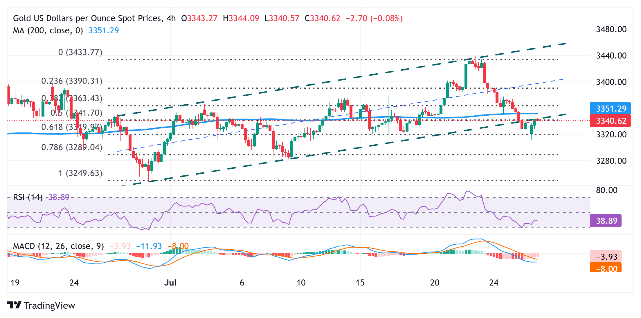与此同时,美国与欧盟(EU)之间的贸易协议增加了最近的乐观情绪,这反过来继续支持了乐观的市场情绪,并可能成为安全避风港黄金价格的阻力。此外,尽管美国总统唐纳德·特朗普多次呼吁降低借贷成本,市场预期联邦储备系统(Fed)将维持利率不变,这有利于美元多头。这可能会有助于抑制无收益的黄色金属,并在周一没有相关的宏观数据的情况下,在确认上周从月度峰值的急剧回撤已经结束之前,需要一些谨慎。