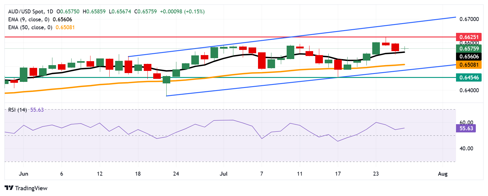 周一,澳元兑美元汇率在0.6570附近交易。日线图的技术分析显示,由于该货币对仍处于上升通道内,总体趋势为看涨。14天相对强弱指数(RSI)位于50上方,增强了看涨趋势。此外,该货币对仍高于九日指数移动平均线(EMA),表明短期价格动量强劲。