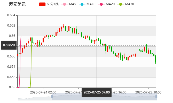 周一(7月28日)亚市盘中,澳元/美元走势冲高回落,盘中一度上涨至0.6586附近,随后探高回落至0.6570附近,截至发稿前澳元兑美元汇率报0.6570,涨幅0.08%主要受美欧达成贸易协议的乐观情绪推动。