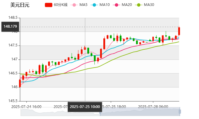 周一(7月28日)亚盘时段,美元/日元上涨突破148关口,最新美元兑日元汇率报147.8500,涨幅0.13%,尽管新协议可能让日本出口商处境恶化,但贸易不确定性的消除为日本央行重启紧缩政策铺平了道路。