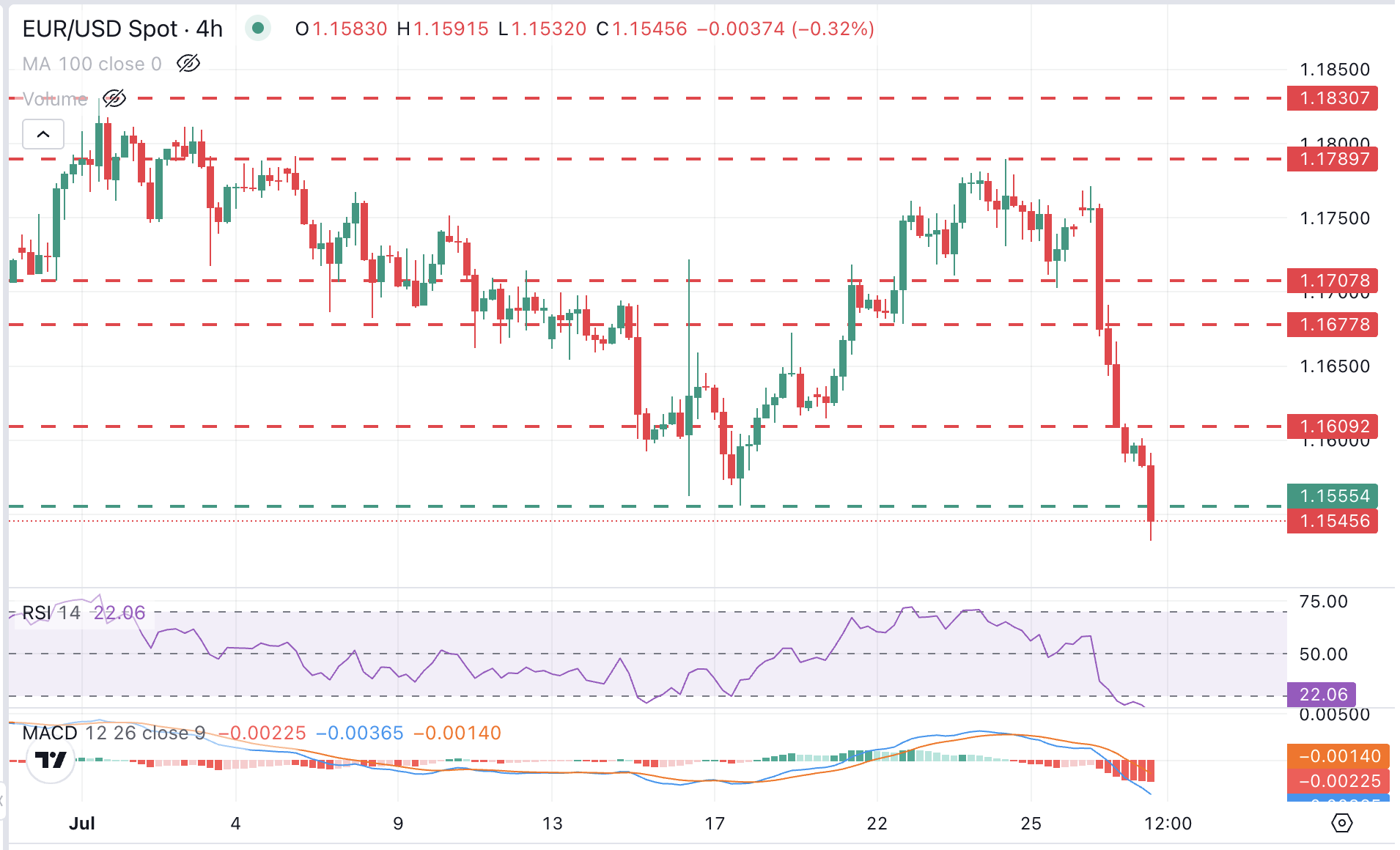 在周二的欧洲早盘,欧元/美元继续下跌,突破了1.1555的支撑区域,创下了一个月来的新的最低点。4小时相对强弱指数(RSI)已经进入了超卖区域,但空方压力依然强劲,该货币对可能会达到心理支撑位1.1500。在该位置下方,6月23日的低点1.14似乎今天的目标太远。