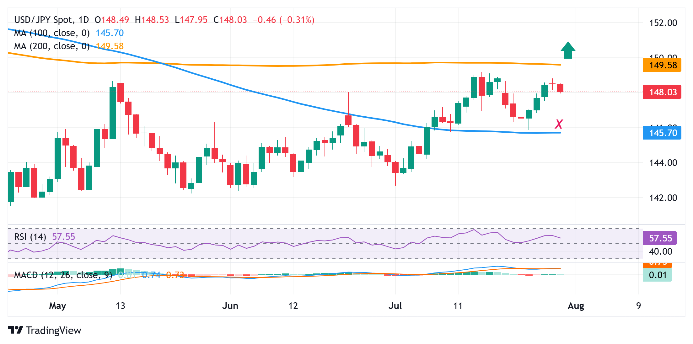 任何后续的下跌可能会在147.75-147.70区域找到不错的支撑,低于该区域美元/日元对可能会测试147.00的整数位,然后下跌至100日简单移动平均线(SMA),目前在146.70区域附近。后者与上周的低点重合,如果 decisively 突破该低点,可能会将短期趋势转向看跌交易者,并使现货价格容易测试低于146.00的水平。