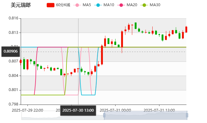 周四(7月31日)美元兑瑞郎汇率今日开盘报0.8144,昨日收盘于0.8136,截至发稿前美元/瑞郎报0.8140,涨幅0.06%,最高价0.8148,最低价0.8125。瑞士法郎近期走势展现出独特的韧性特征。