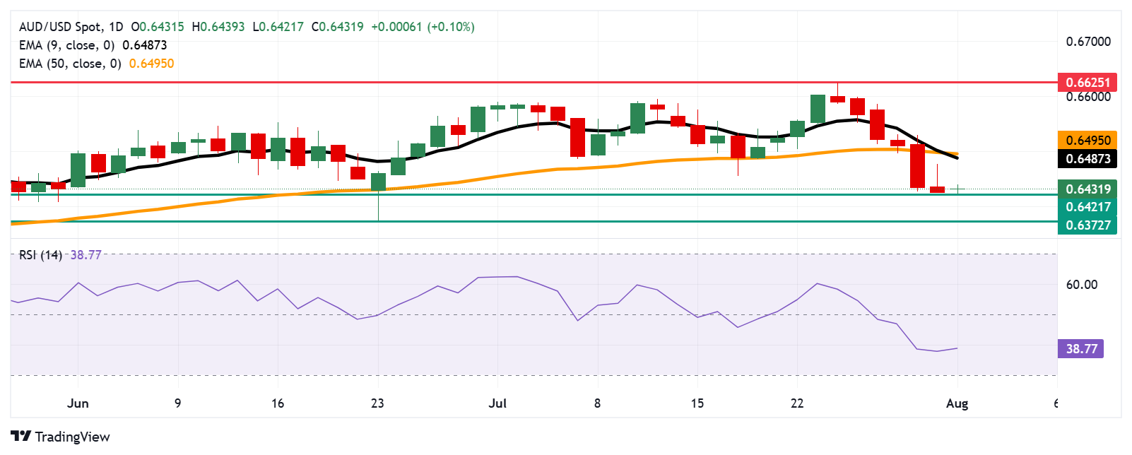周五,澳元兑美元交易价格约为0.6430。日线图的技术分析显示为空方占优,因为14天相对强弱指数(RSI)低于50。此外,该货币对位于九日指数移动平均线(EMA)下方,表明短期价格动量较弱。