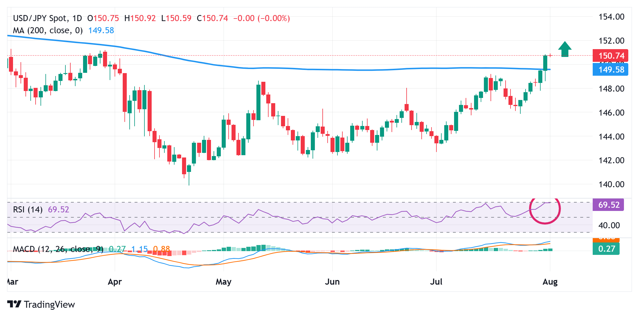 突破非常重要的200日简单移动平均线(SMA)并随后强劲突破150.00心理关口,被看作是美元/日元多头的新触发因素。然而,日线相对强弱指数(RSI)即将进入超买区域,表明现货价格可能会在三月 swing 高点,约在151.20区域暂停上涨。尽管如此,更广泛的格局支持近期强劲上涨趋势的延续。