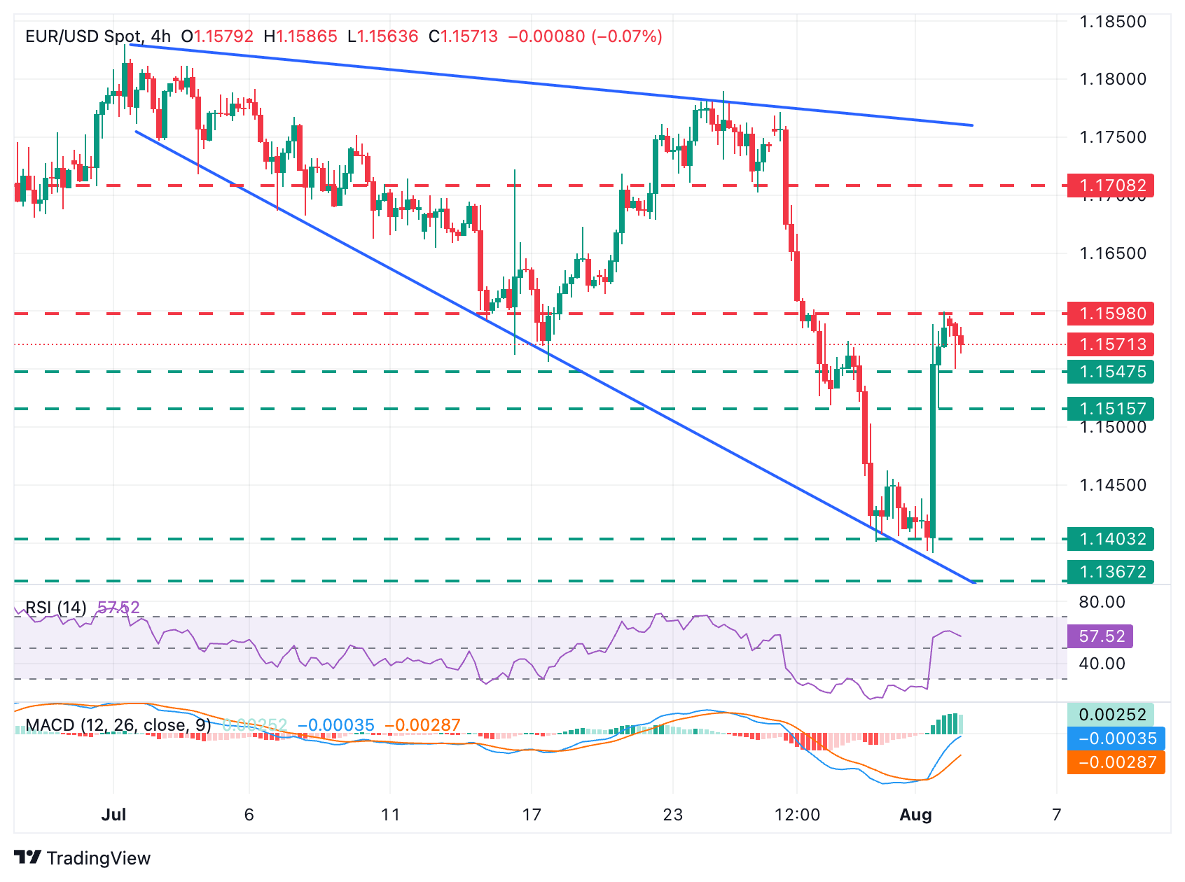 EUR/USD 已经摆脱了上周的疲软,因为投资者对美国经济的担忧使对欧盟-美国贸易协议的失望被放在了次要位置。该货币对从低点反弹,但仍在1.1600下方受限,价格走势在一个扩大的三角形内,这一模式突显出市场情绪。