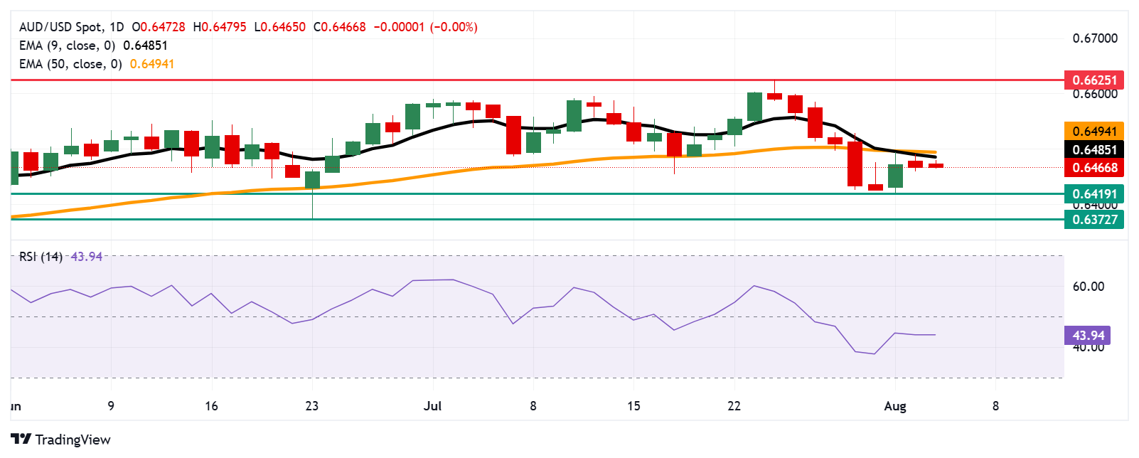 周二,澳元兑美元汇率在0.6470附近交易。日线图的技术分析表明有看跌倾向,14天相对强弱指数(RSI)低于50水平。该货币对也位于九日指数移动平均线(EMA)下方,表明短期动量减弱。