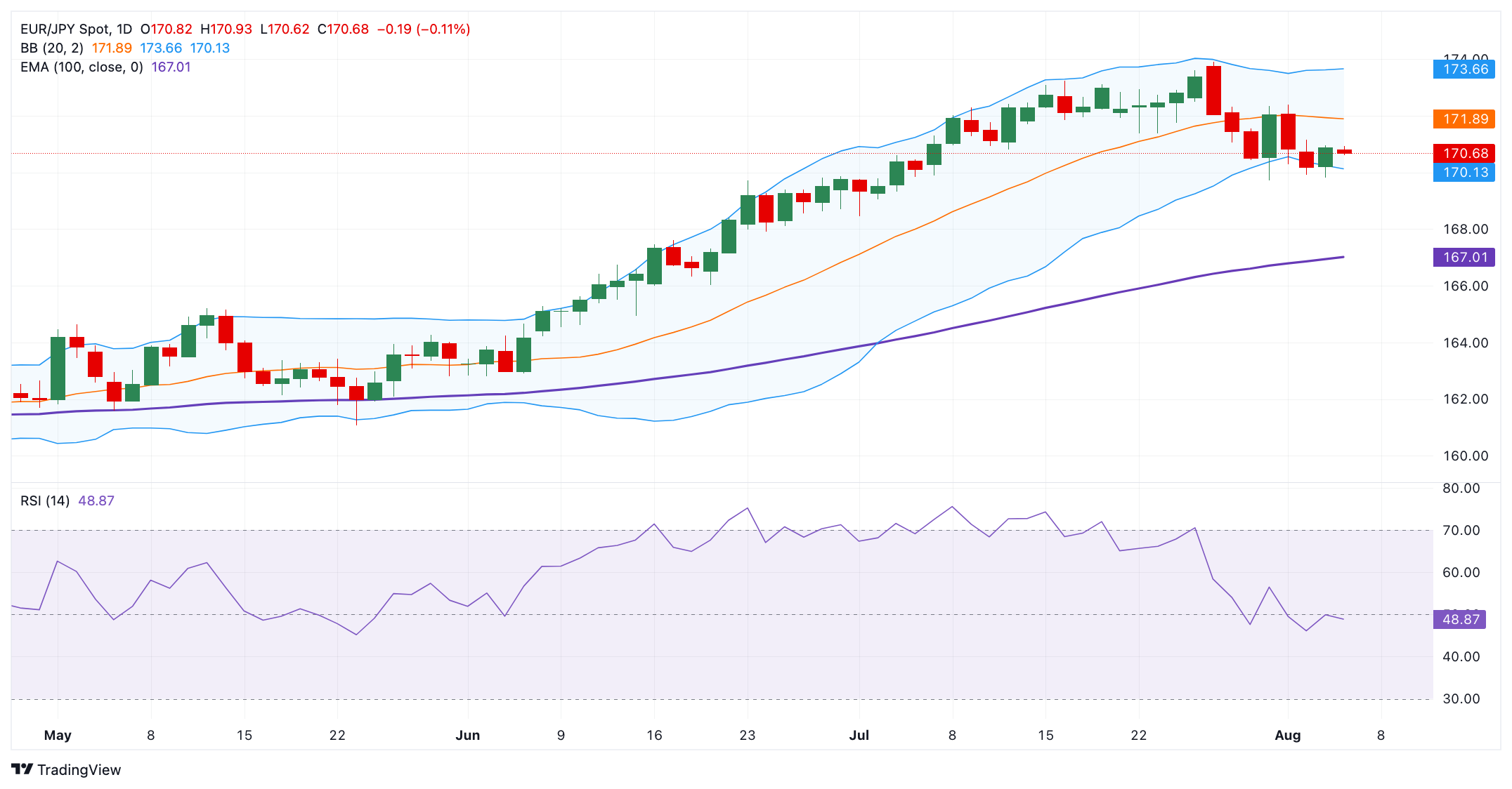 在熊市情况下,170.15的布林线下限成为欧元兑日元的初步支撑位。需要关注的关键防线是170.00的整数位。如果突破这一水平,可能会将该货币对拉低至6月25日的低点168.10。