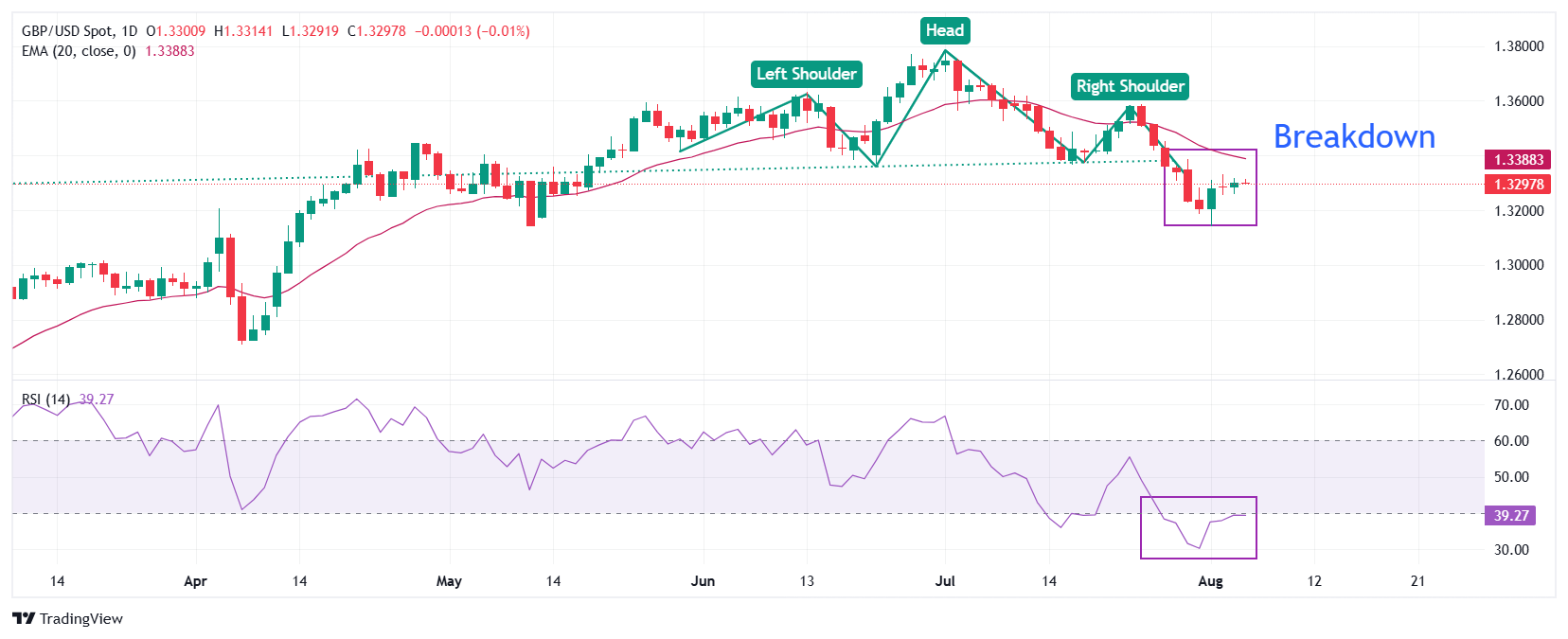 英镑兑美元(USD)在周三围绕1.3300窄幅波动。 对该货币对的展望依然看跌,因为头肩顶(H&S)图表模式成立,且20日指数移动平均线(EMA)斜率为负,接近1.3395。头肩顶模式的 neckline约为1.3388。