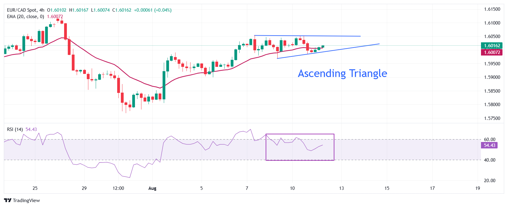 在过去的两周强劲上涨后,EUR/CAD在四小时图上形成上升三角形形态。上述图表的水平边界的上边界位于8月7日的高点约1.6055,而上升边界的下边界则从8月8日的低点1.5970绘制。