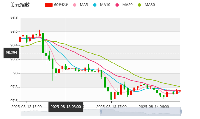 周四(8月14日)亚盘早盘,美元指数最新价报97.76,跌幅0.04%,开盘价为97.80。昨日,美元延续弱势,徘徊在逾两周低点附近,因美国最新通胀数据符合预期,强化了市场对美联储9月降息的押注。