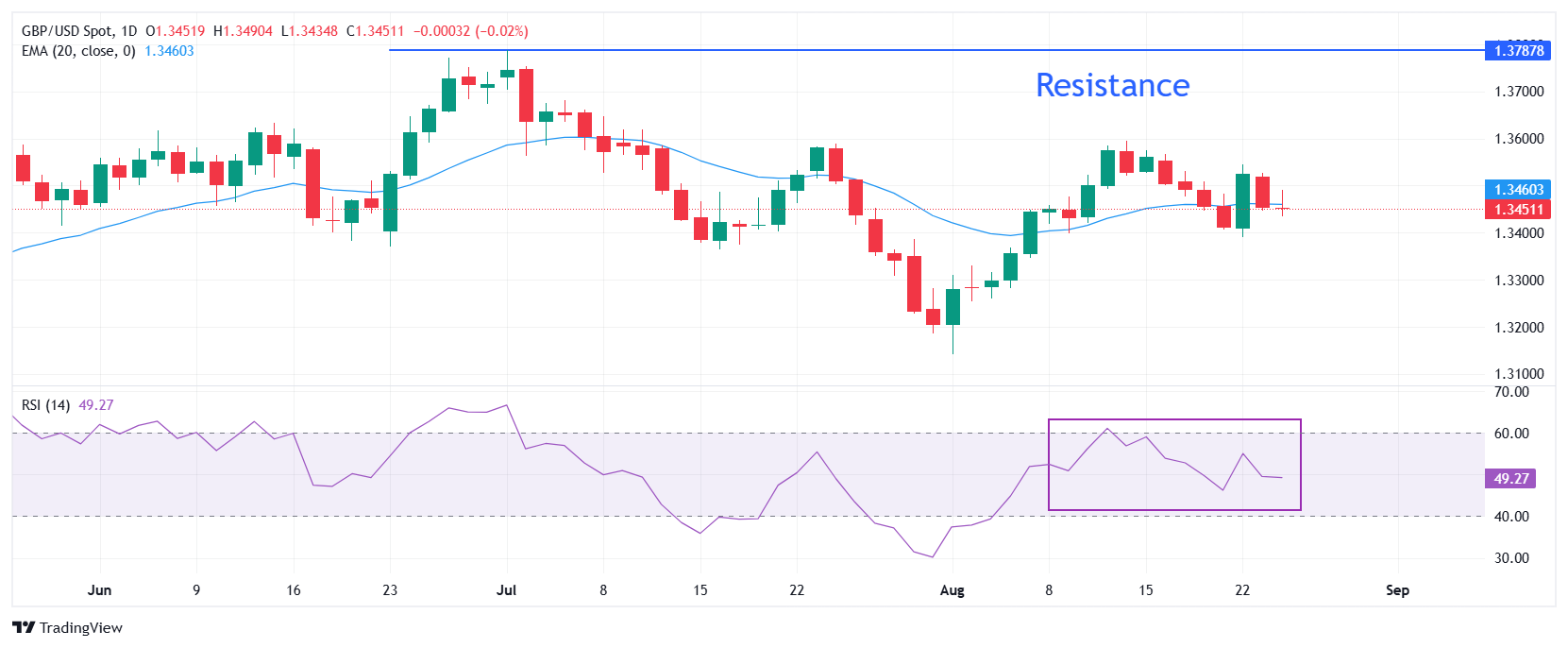 周二,英镑兑美元汇率略有上涨,接近1.3460。 短期展望英镑兑美元对这一货币对的中期方向尚不明确,因为它在20日指数移动平均线(EMA)附近徘徊,目前交易在1.3460左右。
