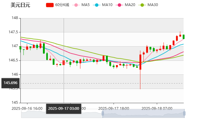周四(9月18日)亚盘早盘,美元兑日元下跌,目前交投于146附近,截止北京时间11:06分,美元兑日元报价146.92,下跌0.03%,上一交易日美元兑日元收盘为146.97。在全球市场风险情绪持续回暖的背景下,投资者的避险需求明显减弱,资金逐渐从传统避险资产中流出,令日元继续承压。