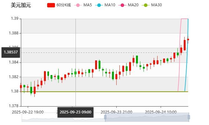周三(9月24日)亚盘早盘,美元兑加元最新价报1.3844,涨幅0.09%,开盘价为1.3834。美元/加元汇率近期持续走强,整体走势仍处于三角形整理形态之中。该货币对的强势主要受美联储与加拿大央行货币政策分化的推动。