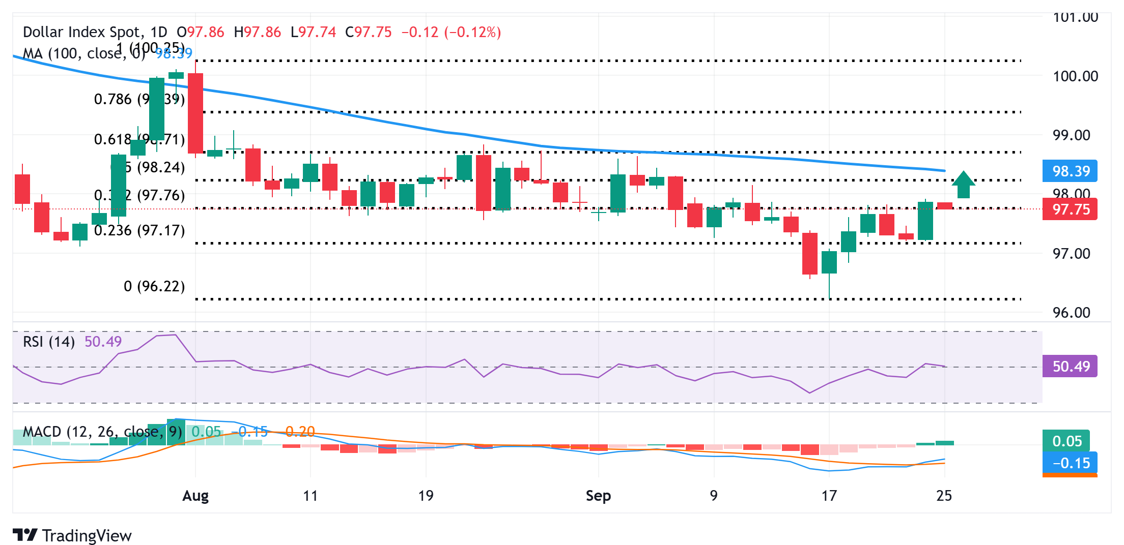 美元指数价格预测:DXY从两周高点有所缓解,下跌至97.75/38.2%斐波那契回撤位