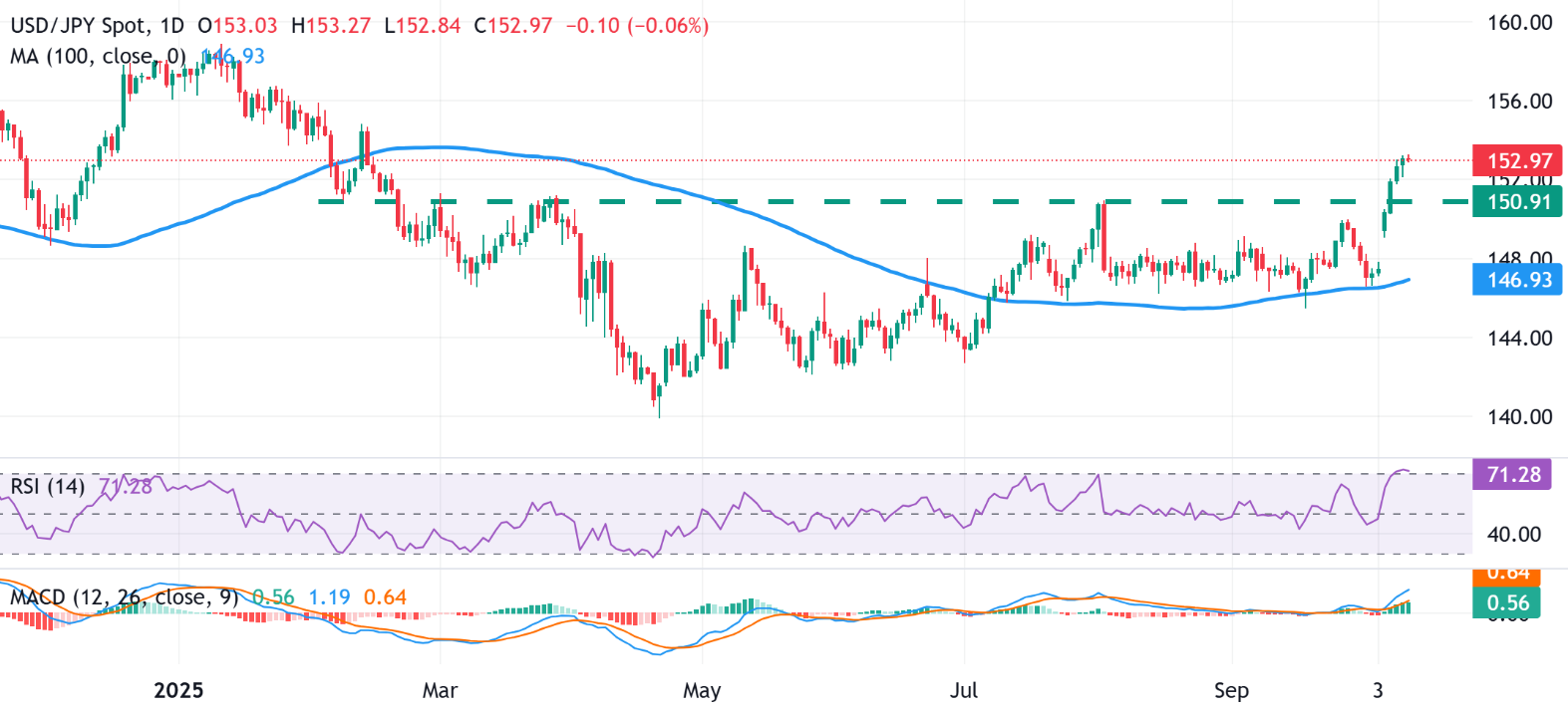 美元兑日元汇率在突破151.00关键阻力位后收盘站上153.00水平,这进一步支持了该货币对的进一步上涨。然而,日线相对强弱指数(RSI)显示市场略有超买,这在一定程度上抑制了多头的新开仓。尽管如此,更广泛的 Technical 设置表明现货价格的最可能路径仍然是上涨,任何修正性调整可能会被视为在152.60-152.55区域附近的买入机会。这应该有助于限制价格在152.00整数水平附近的下跌。