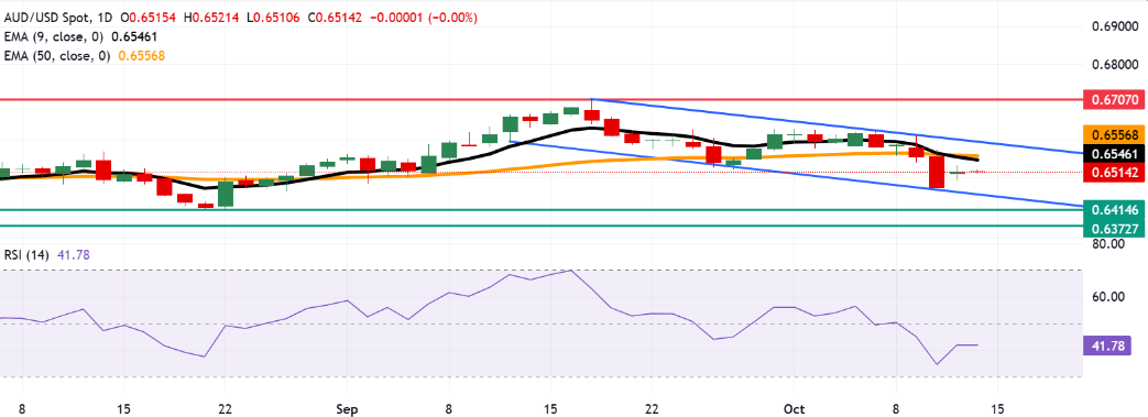 澳元兑美元周二在0.6510附近交易。日线图上的技术分析表明,由于该货币对在下降通道内向下移动,总体趋势仍然是看跌的。此外,14天相对强弱指数(RSI)仍低于50水平,进一步增强了看跌 bias。