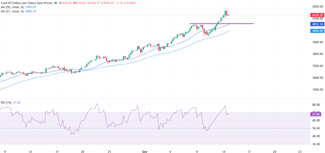 截至撰写本文时,XAU/USD在从记录高点下跌至4,090美元后,目前保持在4,100美元以上。这一走势反映了在过度上涨后的获利回吐,因为交易员调整头寸以锁定近期收益。然而,由于对世界两大经济体之间长期贸易僵局的担忧继续主导市场情绪,下方仍然得到支撑。