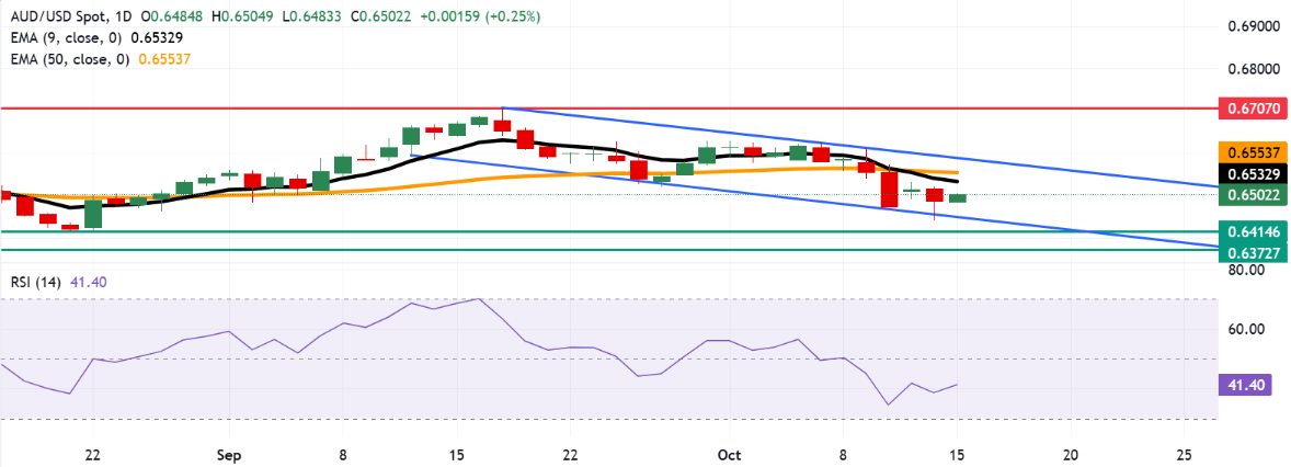 澳元兑美元周三在0.6500附近交易。日线图上的技术分析表明,由于该货币对仍处于下降通道内,因此总体趋势仍然是看跌的。此外,14天相对强弱指数(RSI)仍然低于50水平,进一步增强了看跌 bias。