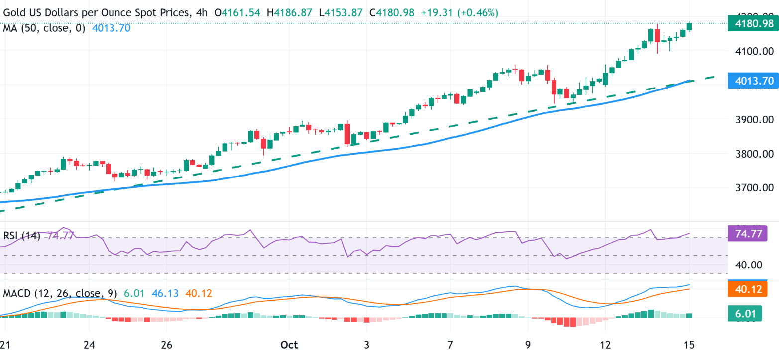黄金 (XAU/USD) 在周三的欧洲交易时段上半段,持续创下历史新高,日内涨幅超过4200美元,这得益于有利的基本面背景。在地缘政治紧张局势的背景下,美国和中国之间的贸易冲突进一步升级,成为推动避险贵金属的主要因素,这引发了对美国政府长时间停摆的担忧。此外,鸽派的 (Fed) 期望也推动了资金流向无收益的黄色金属。联邦储备系统