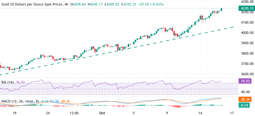 在过去的一个月左右,XAU/USD对在上升趋势线上呈上涨趋势。此外,昨晚在4200美元整数位上方的持续突破和接受可能被视为多头的新触发因素。然而,极度超买的每日相对强弱指数(RSI)在进行进一步升值操作之前需要谨慎。