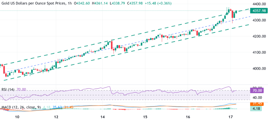 另一方面,如果价格突破4379-4380区域,或者亚洲时段高点,可能会延续至突破4400整数关。后者持续的强劲表现将被视为看涨交易者的最新触发因素,并帮助黄金价格延长其过去两个月左右的中期上涨趋势。