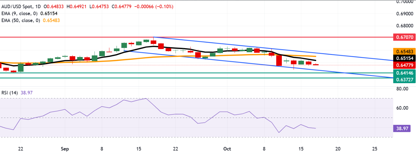 周五,AUD/USD 交易价格约为 0.6480。 日线图的技术分析表明,由于该货币对在下降通道内移动,空方偏好看似仍在持续。 此外,14 天相对强弱指数 (RSI) 仍然低于 50 水平,加强了空方偏好看似仍在持续。