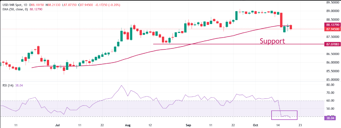 美元/印度卢比在本周初走低,跌至接近87.90。50天指数移动平均线(EMA)接近88.13,成为美元/印度卢比多头的关键障碍。
