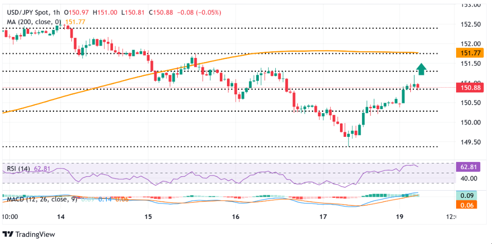 日内上涨推动现货价格突破了最近从月度峰值下跌的38.2%斐波那契回撤水平。此外,1小时/日线图上的积极振荡指标支持进一步升值至151.75汇合点——包括61.8%的斐波那契回撤水平和200小时简单移动平均线。持续突破后者应使美元/日元对超过152.00水平,并进一步上涨至152.25阻力区域,然后目标是153.00水平。