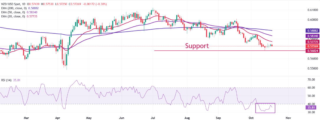 纽元兑美元保持在六个月来的低点附近0.5740。由于所有短期到长期的指数移动平均线(EMAs)都呈下降趋势, Kiwi货币对的整体趋势是看跌的。