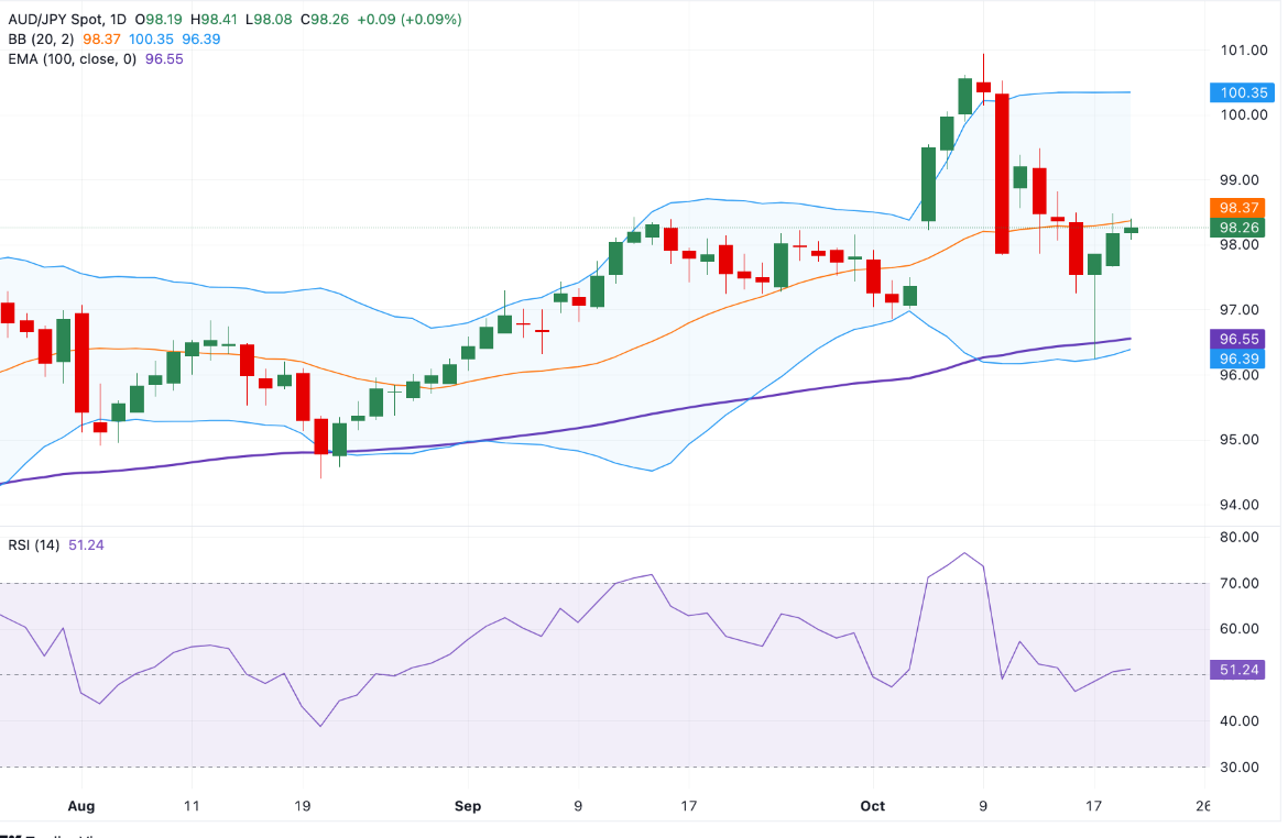 缺点是,澳元兑日元的关键支撑位位于10月16日的低点97.25。需要关注的额外下跌过滤器是96.70,即100天指数移动平均线。再往南,下一个争议点是96.40,即布林带的下限。