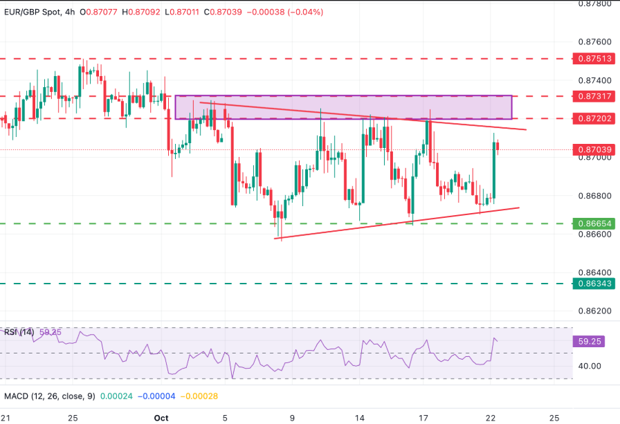 这对组合已经达到了日内高点,接近在0.8715和0.8730区域的三角形顶部阻力群,自十月初以来,这个区域反复限制了上涨尝试。在此之上,目标是今年至今的高点,即0.8750。