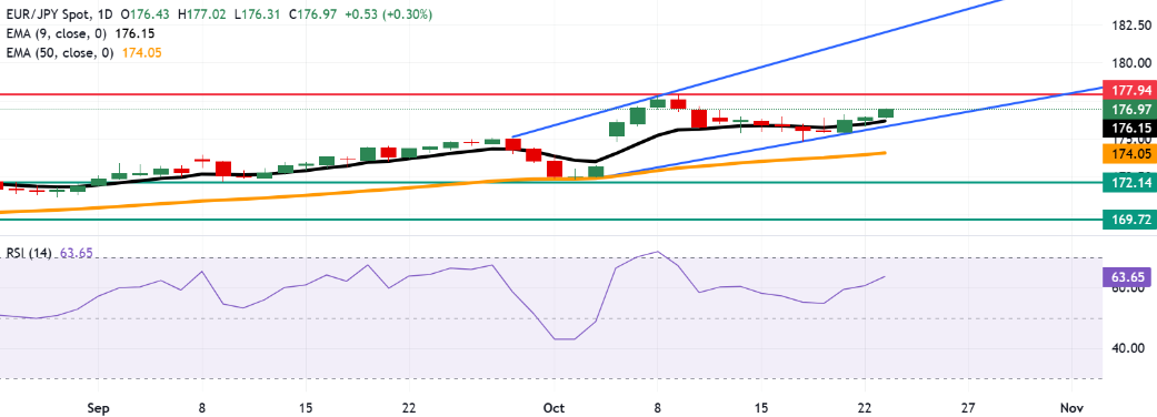 EUR/JPY连续第三个交易日上涨,在周四的欧洲时段交易于177.00附近。日线图的技术分析显示,由于该货币交叉保持在上升通道内,看涨偏好看起来正在加强。