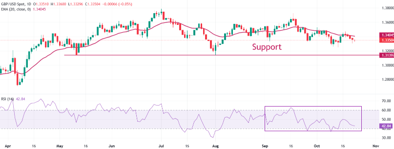 英镑兑美元在撰写本文时,交易在周三的交易区间内,约为1.3350。英镑兑美元的短期趋势仍然不确定,因为它在20日指数移动平均线(EMA)附近交易,该平均线约为1.3404。