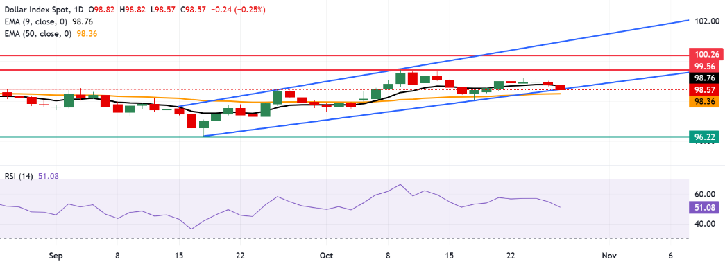 美元指数(DXY),用于衡量美元对六种主要货币的价值,连续第二天扩大损失,在周二亚洲时段交易于98.60附近。日线图的技术分析显示,美元指数正在测试上升通道的下边界,这表明可能从看涨转向看跌。